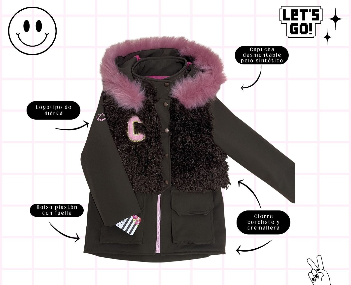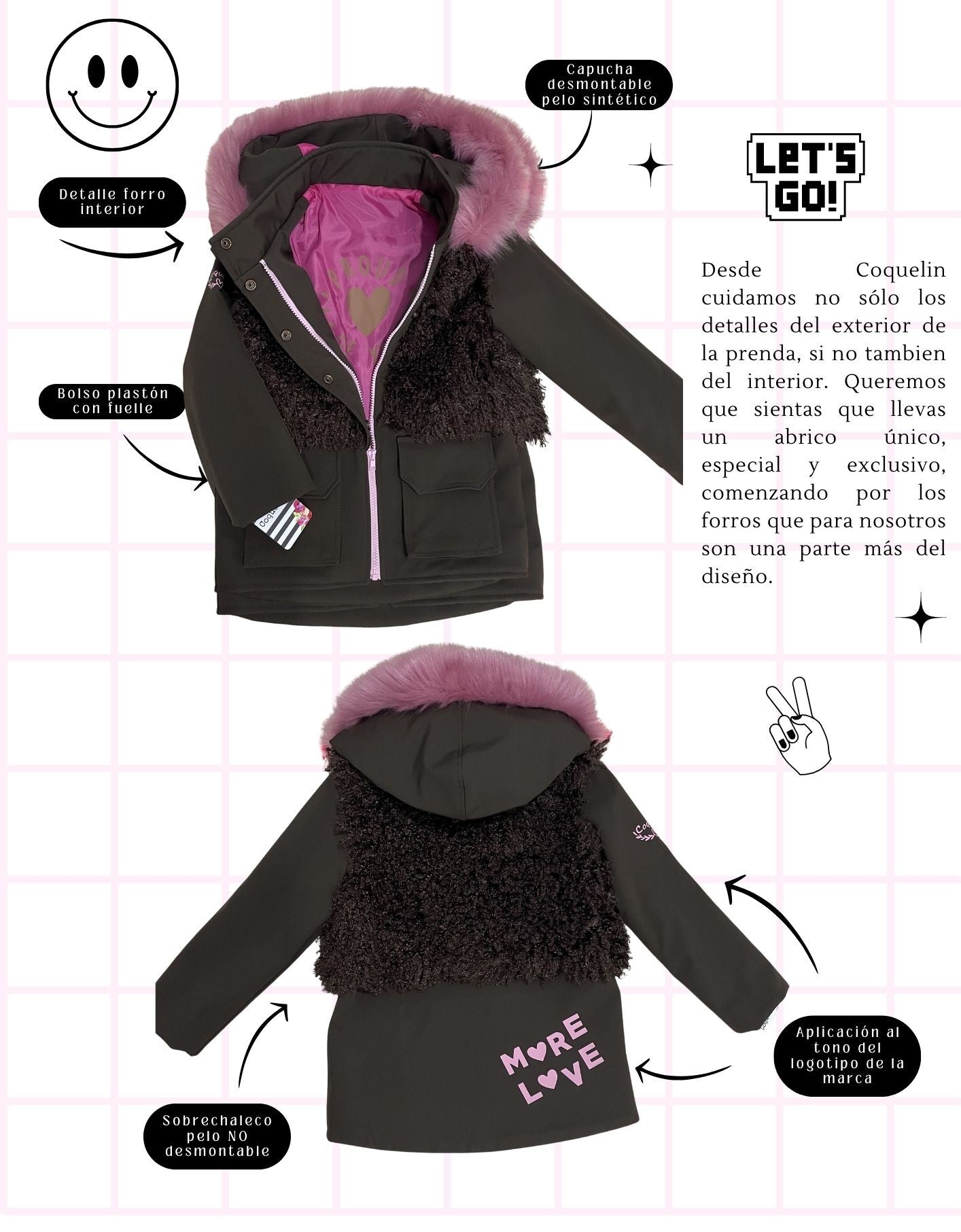 El sobrechaleco de pelo marrón, no desmontable, junto con las aplicaciones rosas hacen que este abrigo esté diseñado para las que quieren una prenda especial y sofisticada en su armario.