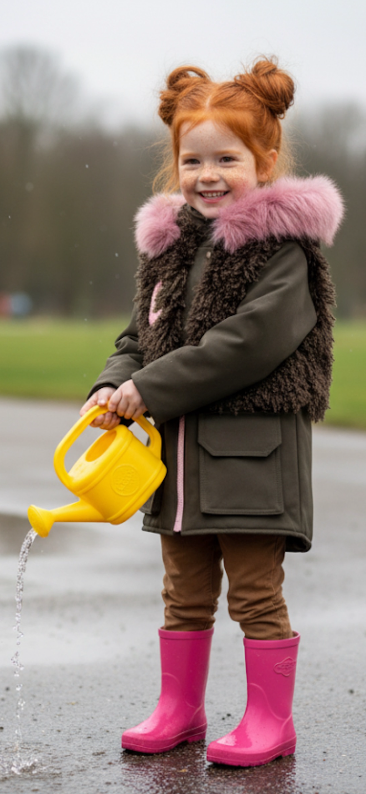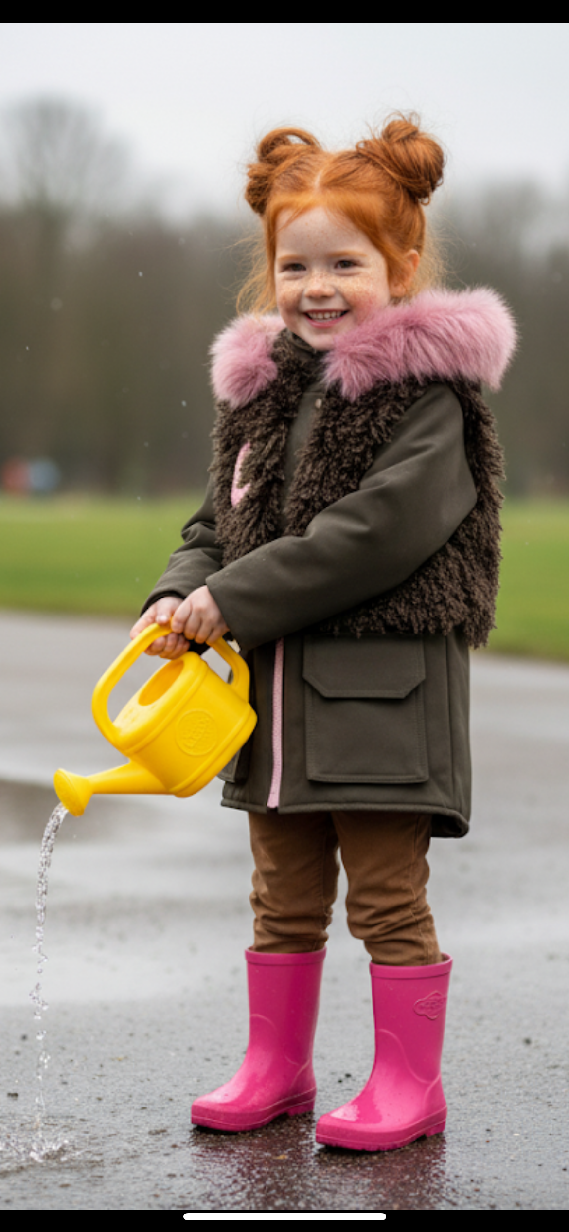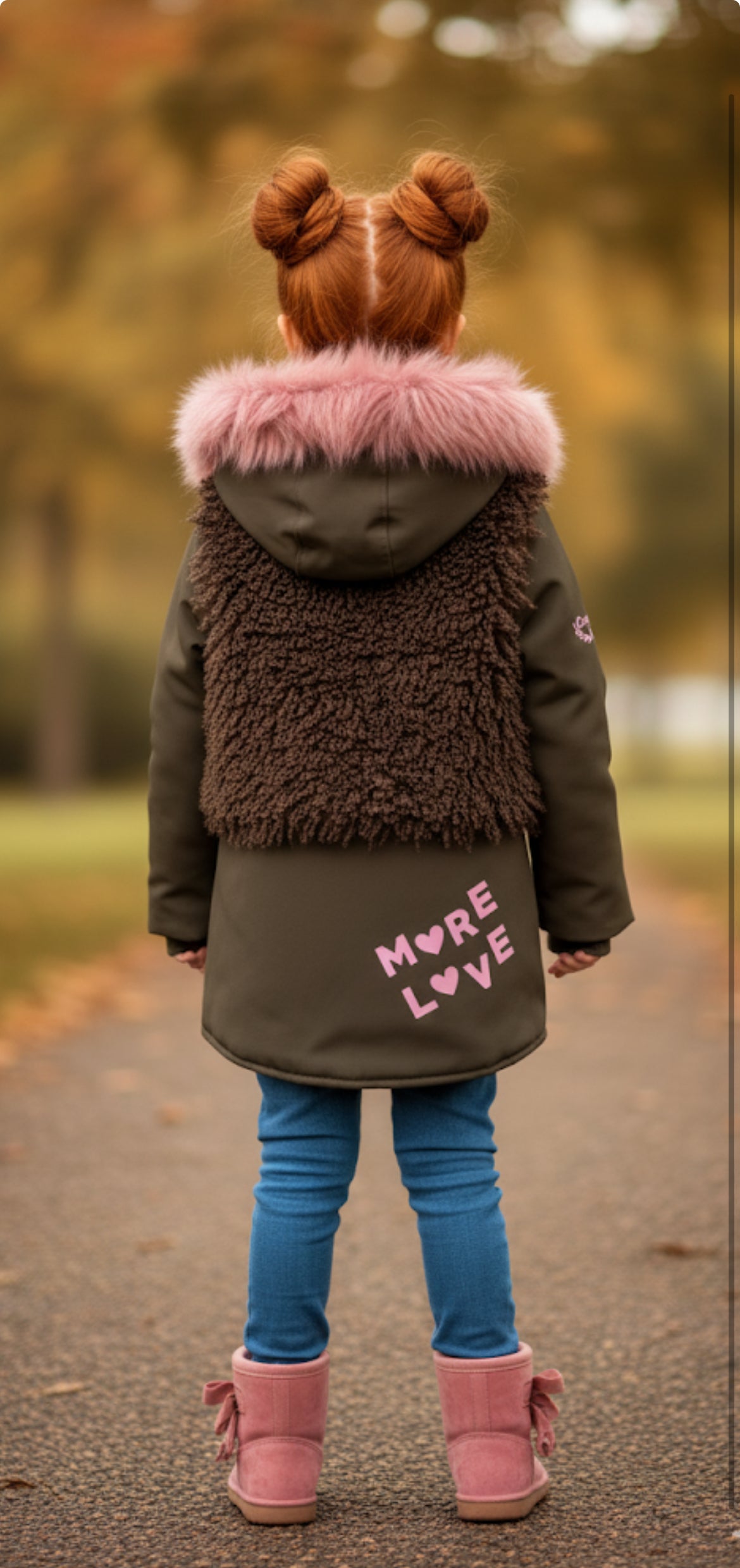 El sobrechaleco de pelo marrón, no desmontable, junto con las aplicaciones rosas hacen que este abrigo esté diseñado para las que quieren una prenda especial y sofisticada en su armario.