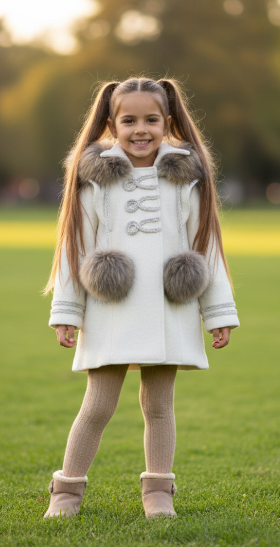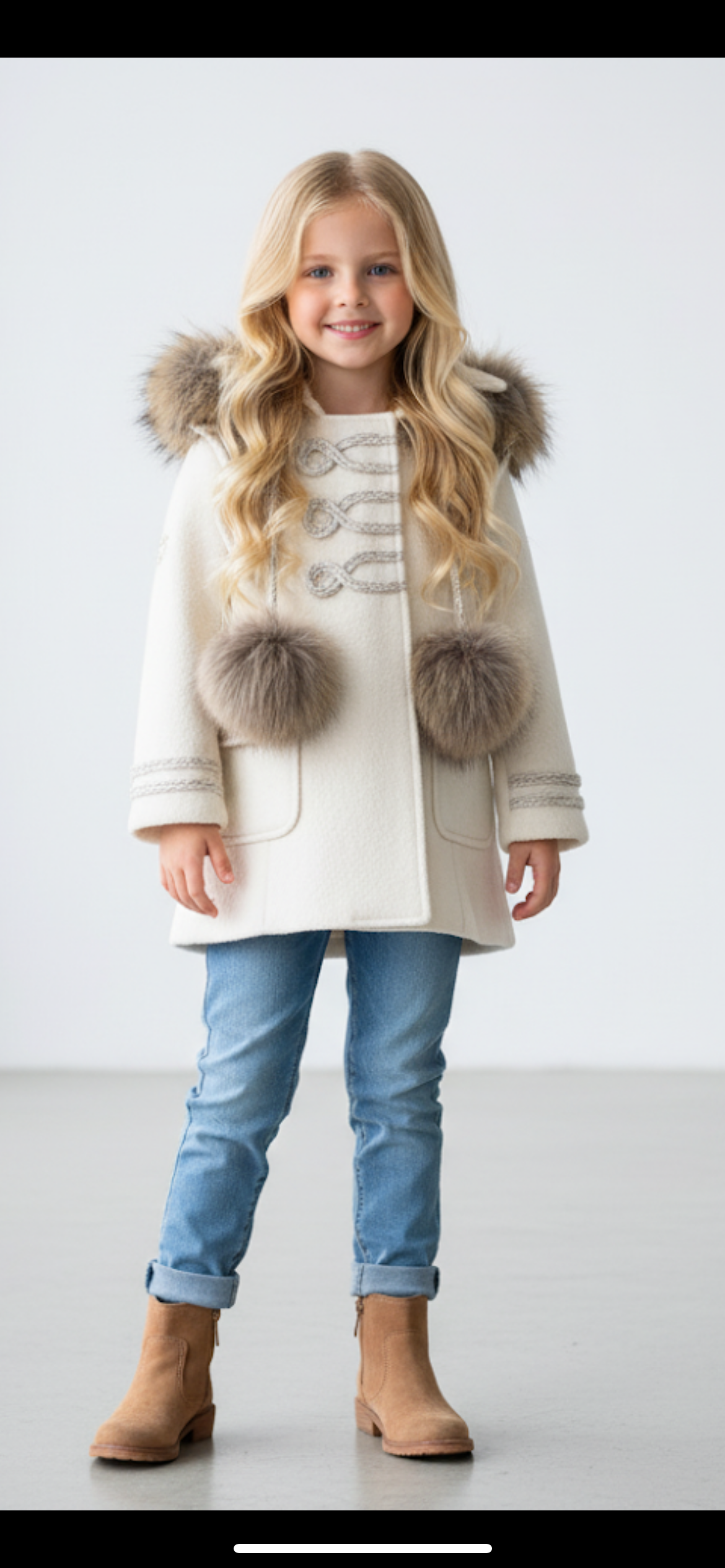 Una prenda capricho sólo apta para las clientas más exigentes que valoren no sólo el diseño si no la calidad de los materiales y la confección exquisita. Fabricado en paño de lana y pelo de zorro certificado SAGA FURS de procedencia europea.